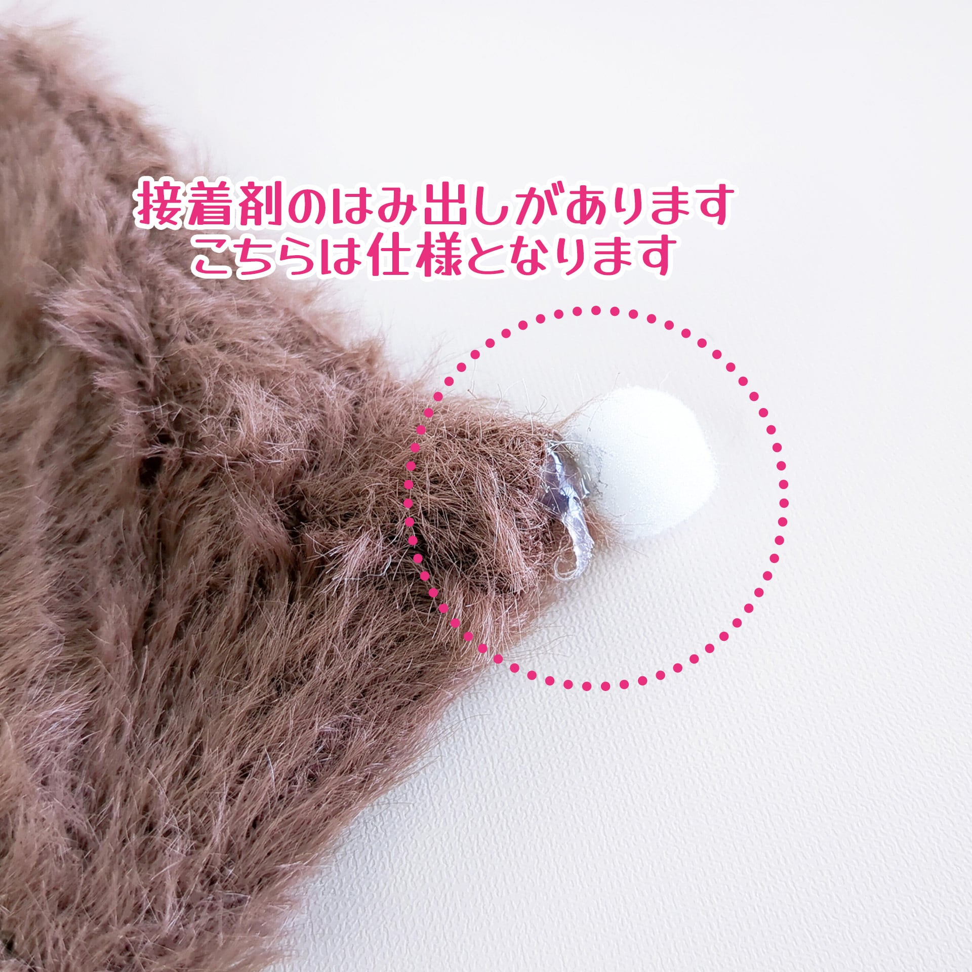 ぼうしの飾りの接着剤のはみ出しがあります。こちらは仕様と致しますので、予めご了承下さい(画像参照)