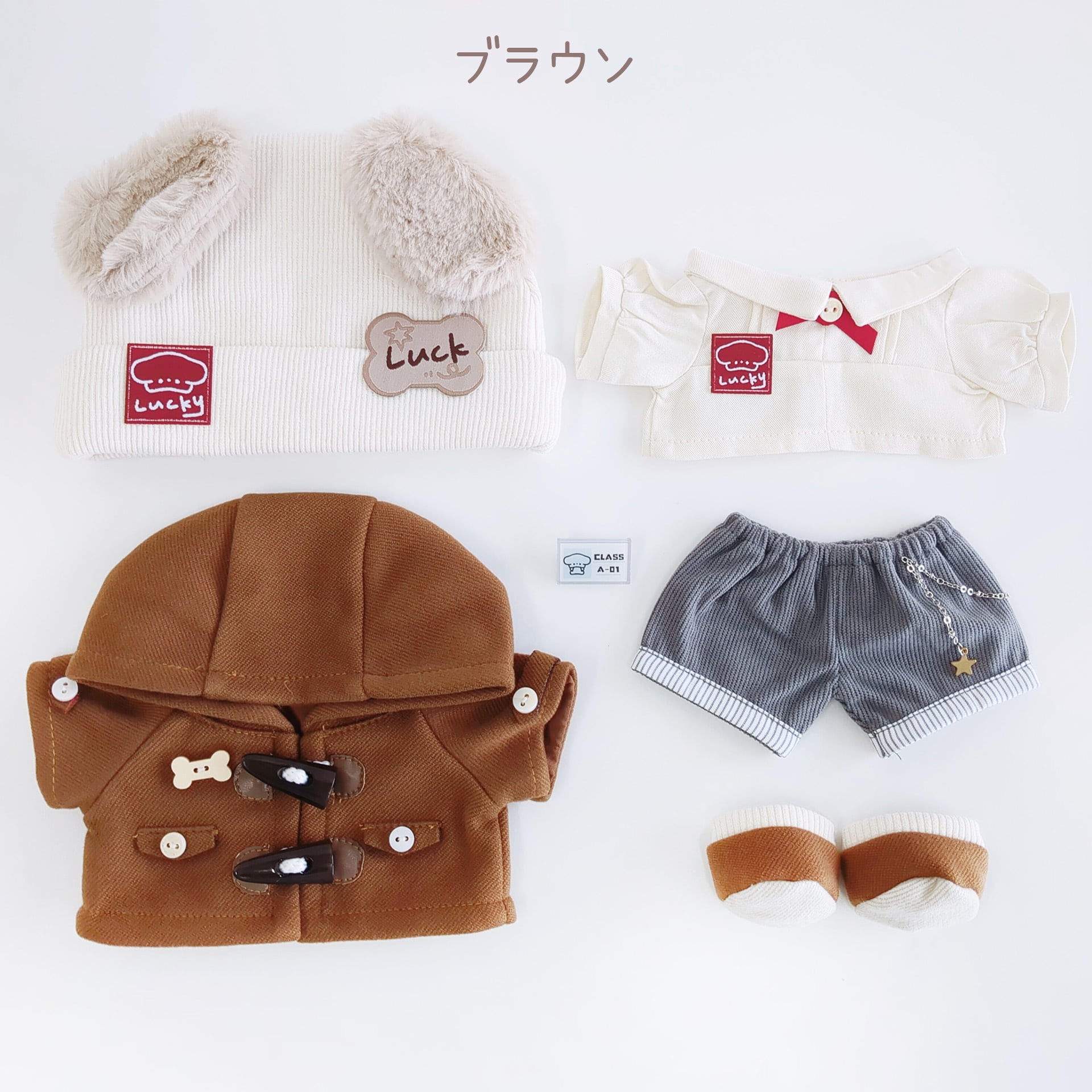 【ぼうし、コート、トップス、ボトムス、シューズ、安全ピン付き飾り】6点
