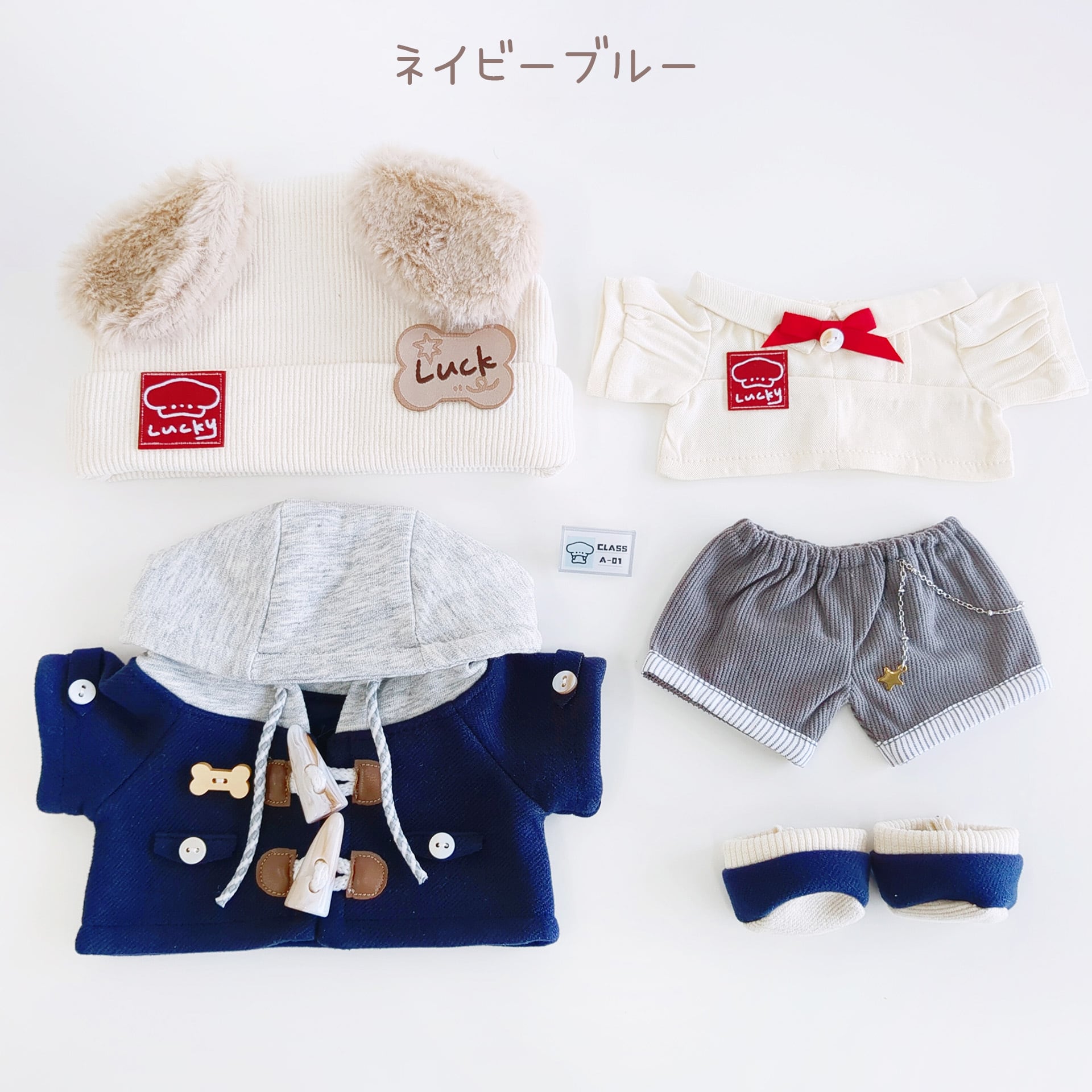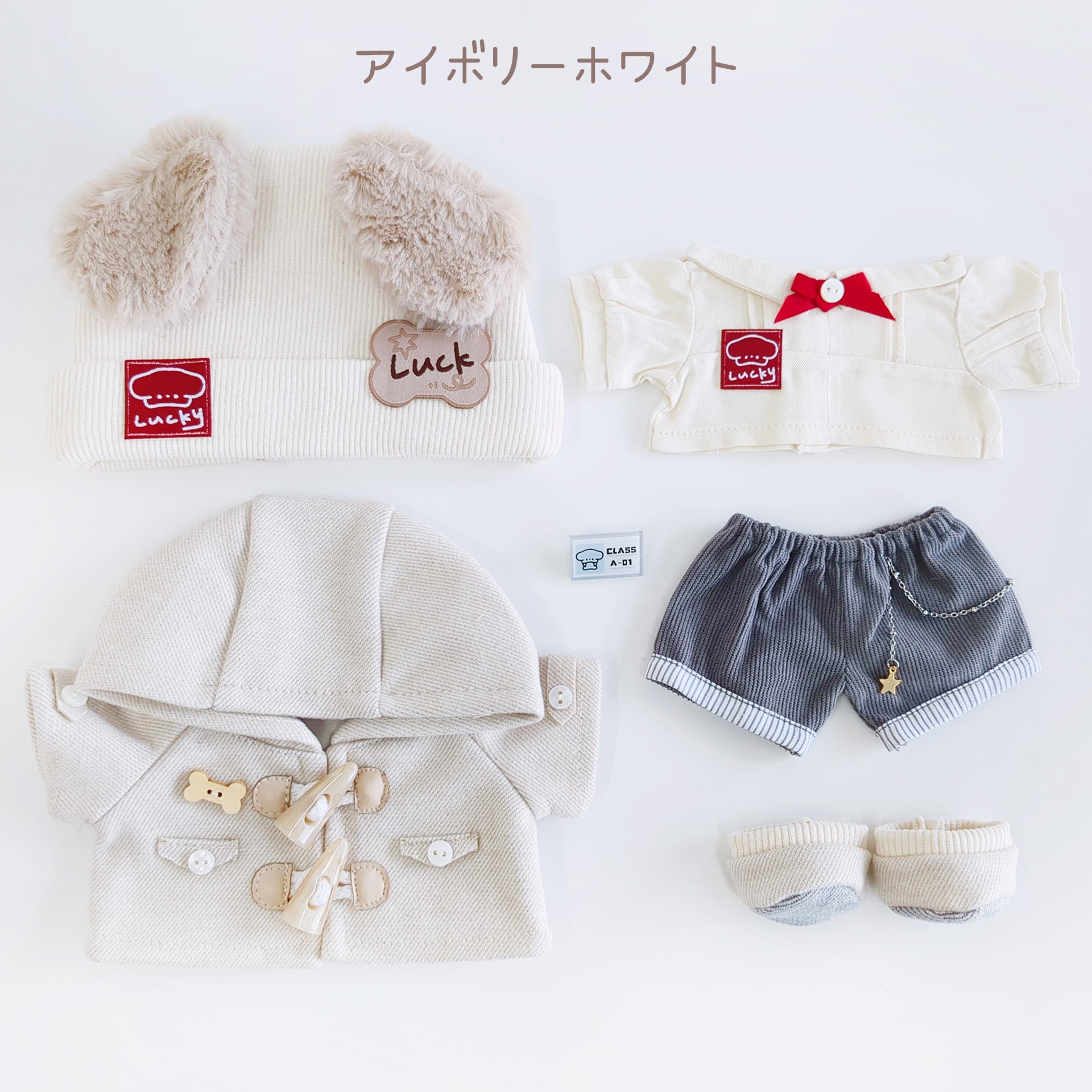 ※衣装や小物からぬいぐるみに色移りする場合があります。特に濃色(紺・黒など)や湿度の高い場所でのご使用はご注意ください。