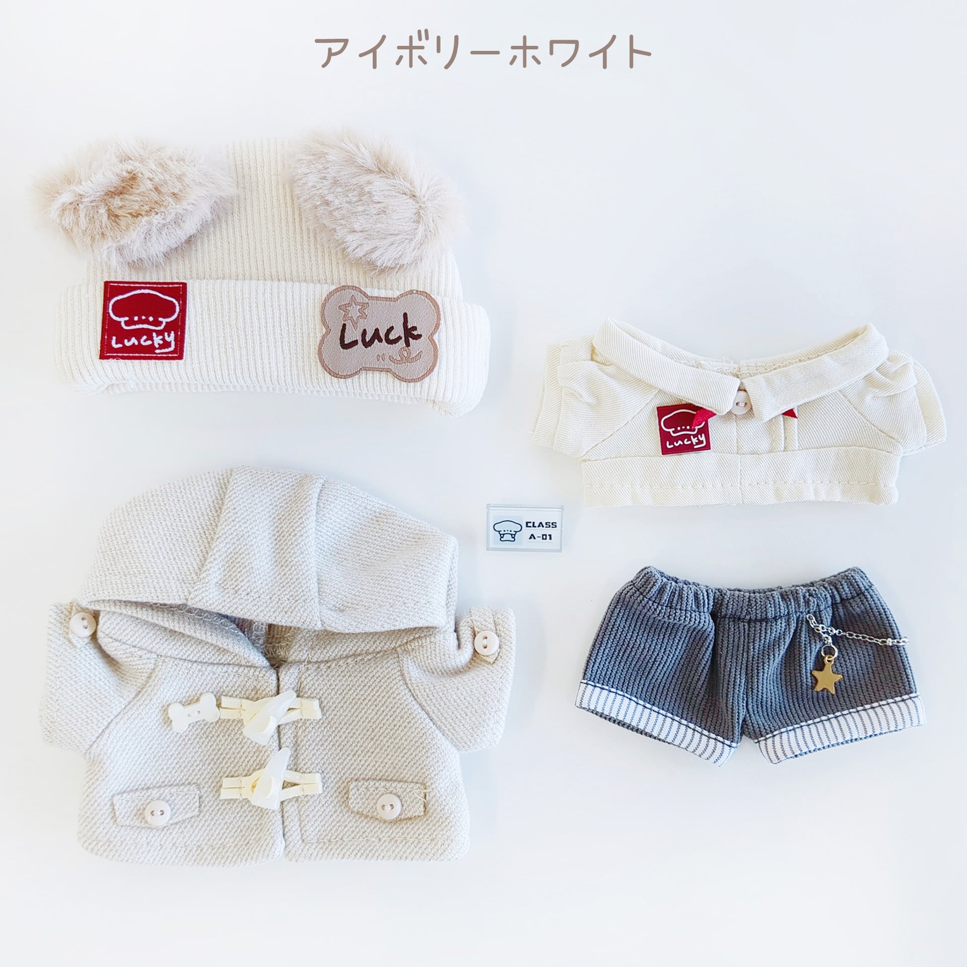 ※衣装や小物からぬいぐるみに色移りする場合があります。特に濃色(紺・黒など)や湿度の高い場所でのご使用はご注意ください。