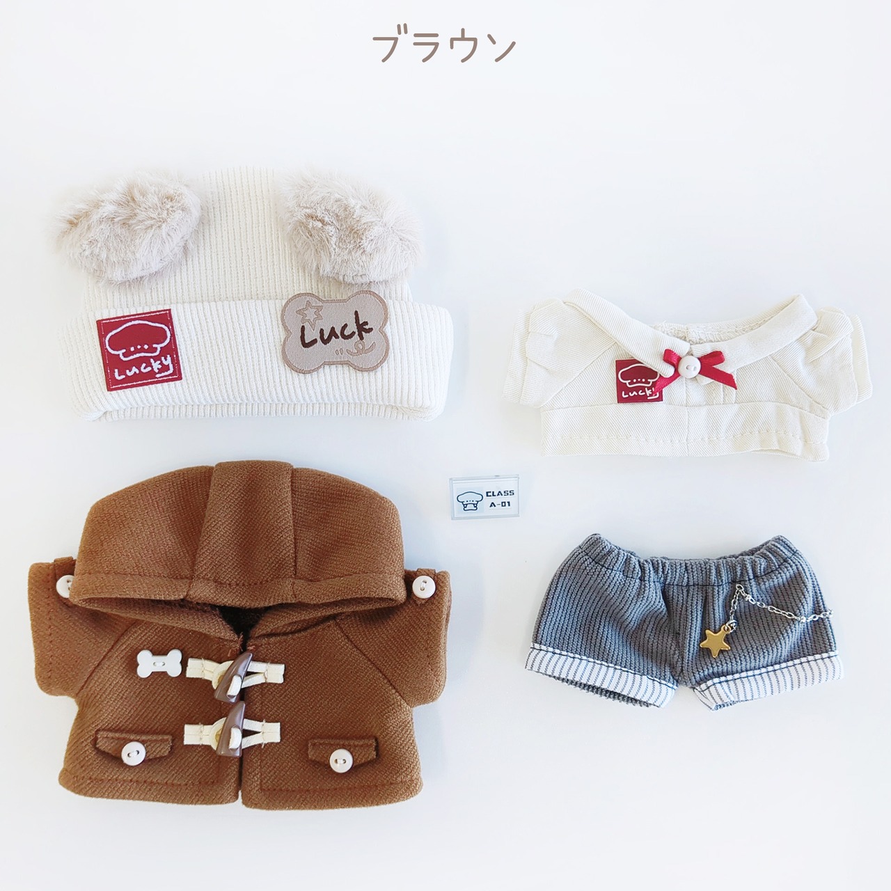 【ぼうし、コート、トップス、ボトムス、安全ピン付き飾り】5点